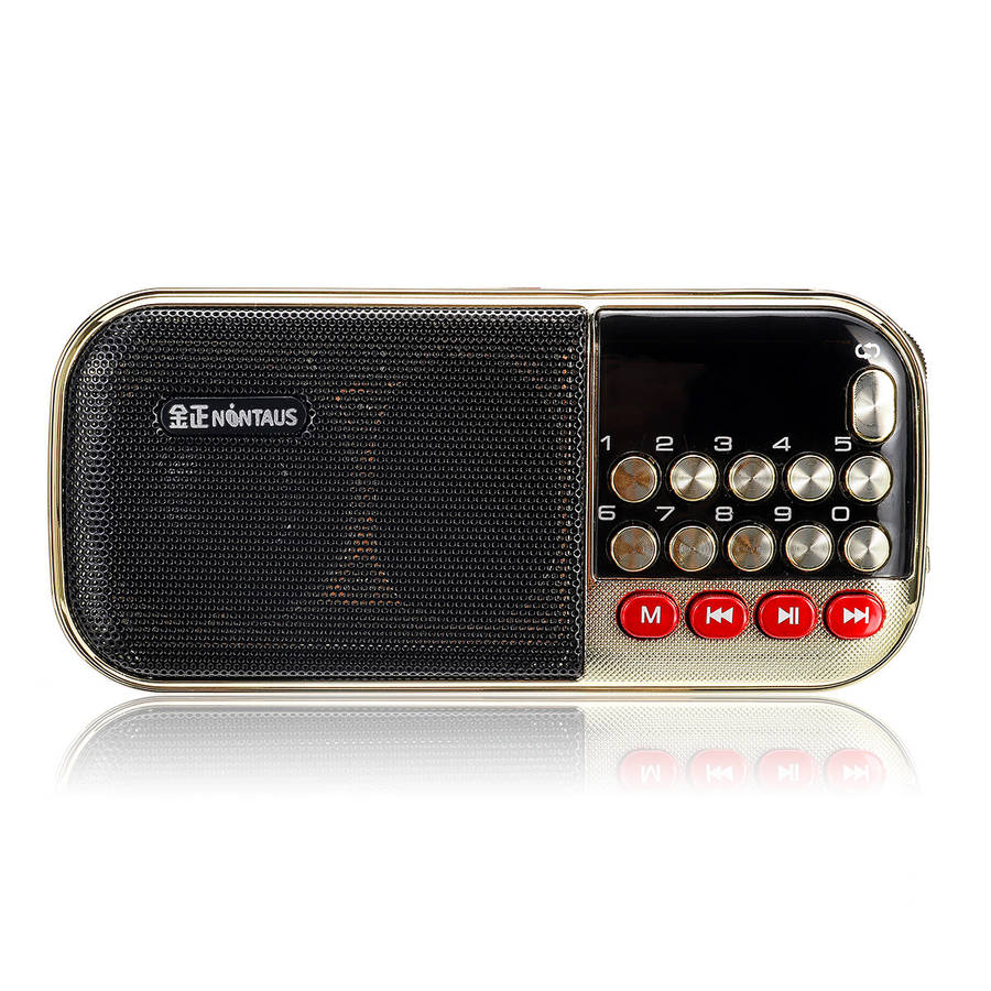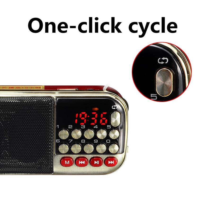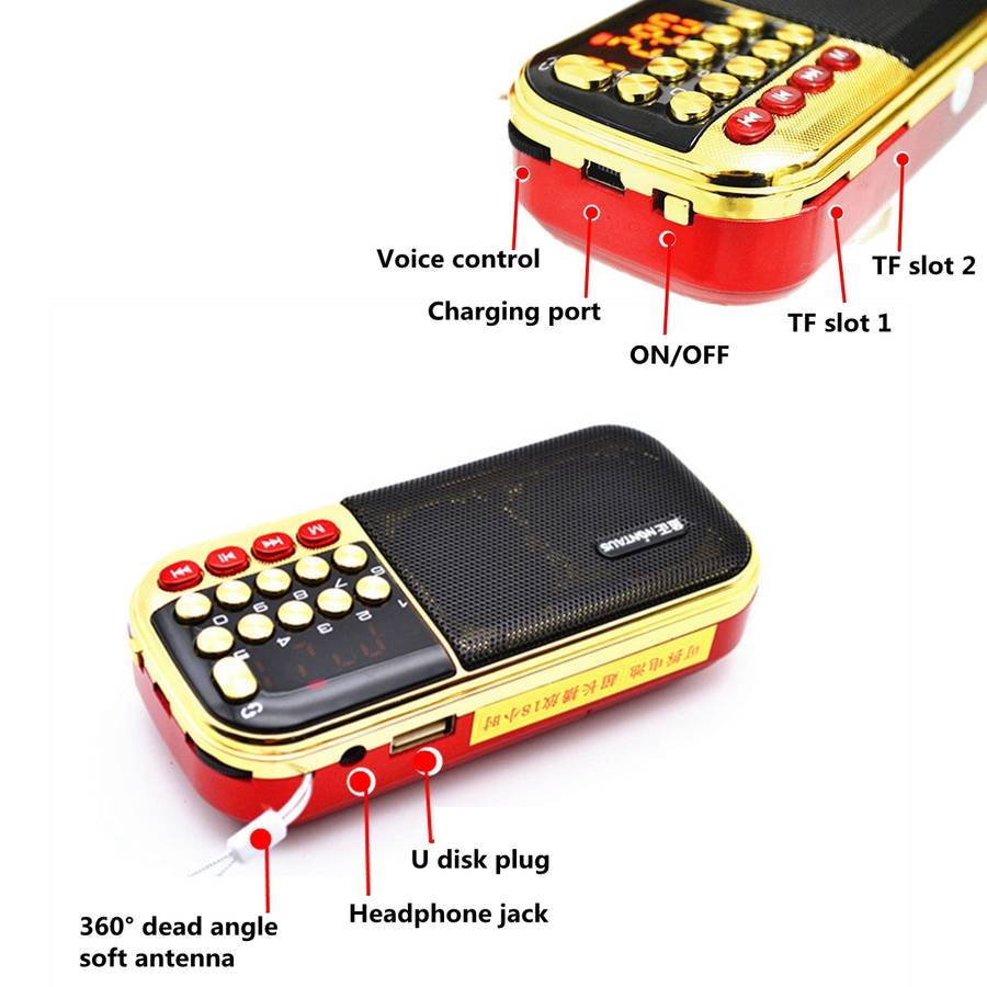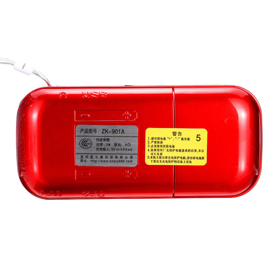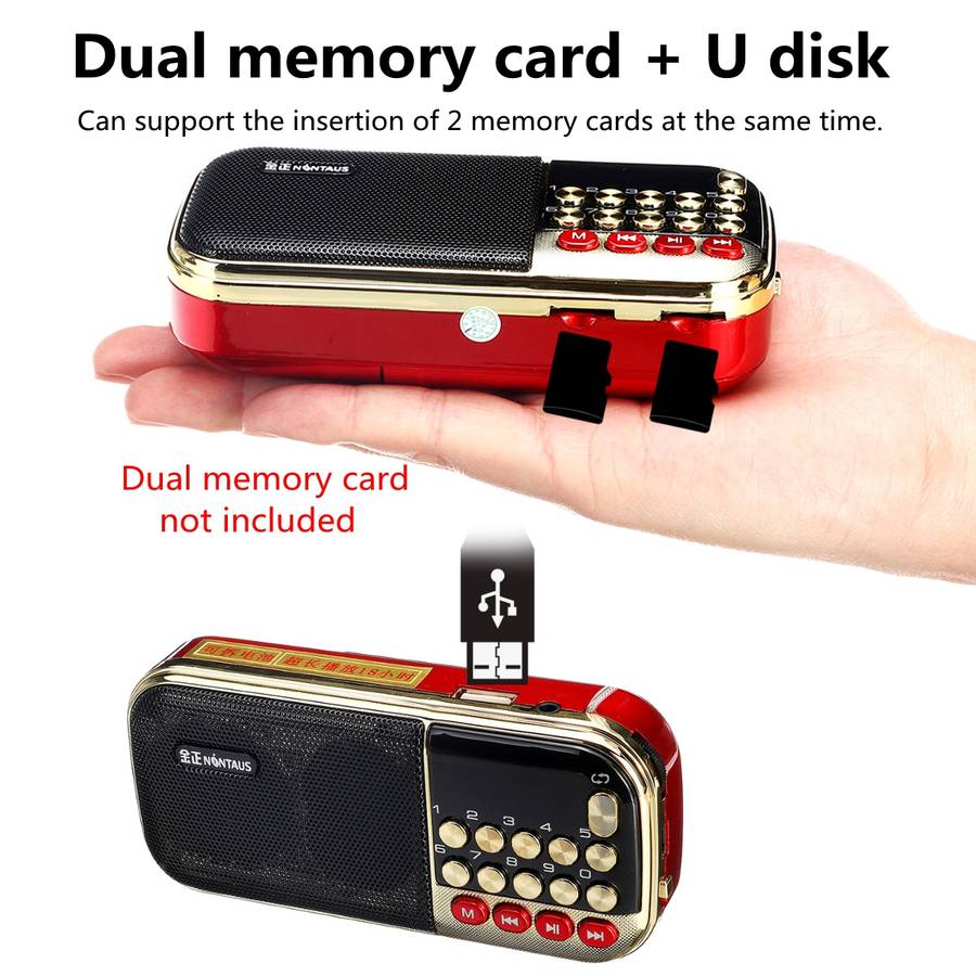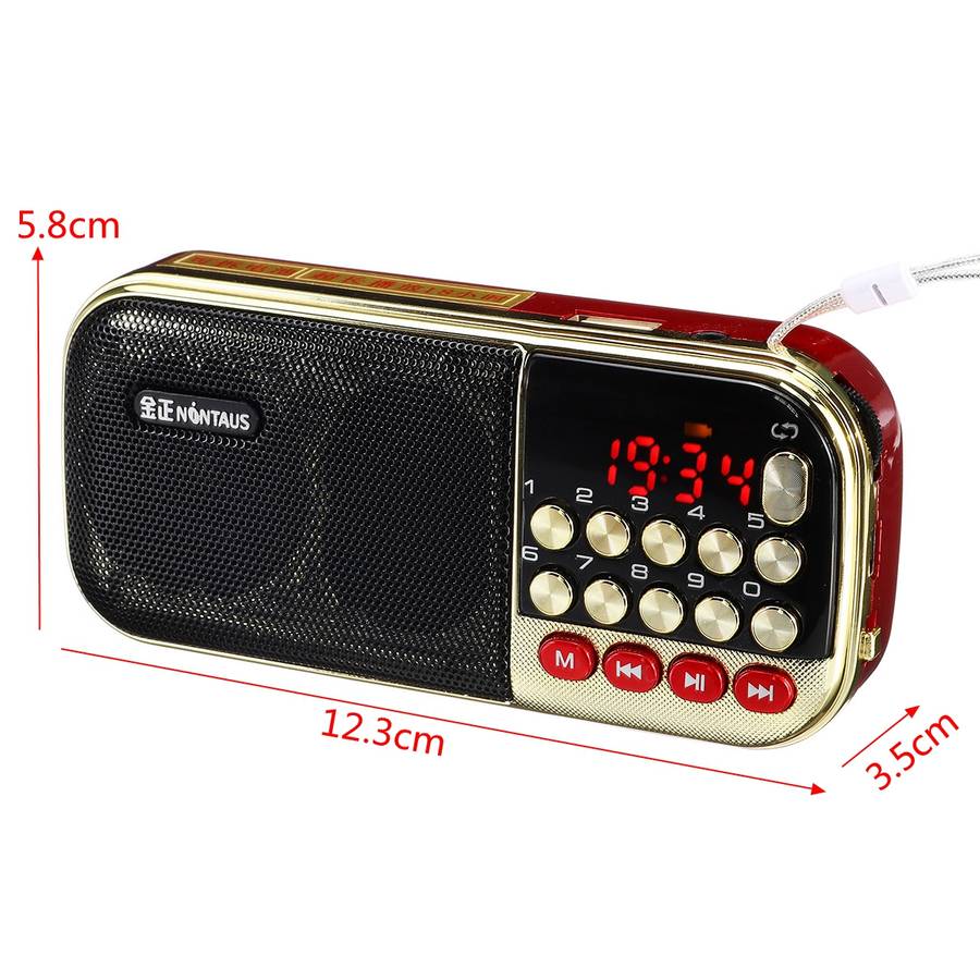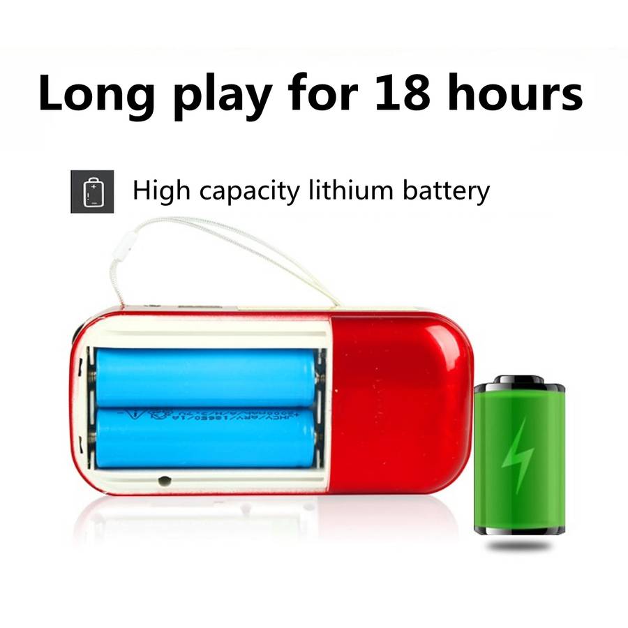 Features: High-capacity lithium battery, playing for 18 hours Dual magnetic speaker, large volume. Stereo sound Dual memory card + USB flash drive. Can support the insertion of 2 memory cards at the same time. Power off memory, accurate to the second One-click cycle Digital channel selection One-click search Frequency range: 87.5-108MHZ Working voltage: 4V Rated impedance: 4 Power: 3W MP3 bit rate: 8k 320k bps Frequency response: 20Hz-20KHz Signal to noise ratio: 85dB Distortion: <0.05 Size: 12.3 x 3.5 x 5.8cm Note: Please allow 0.5-1 cm differences due to manual measurement. Due to the light and screen difference, the item's color may be slightly different from the pictures. Package Included: 1 x Portable Radio 1 x USB Charging Cable