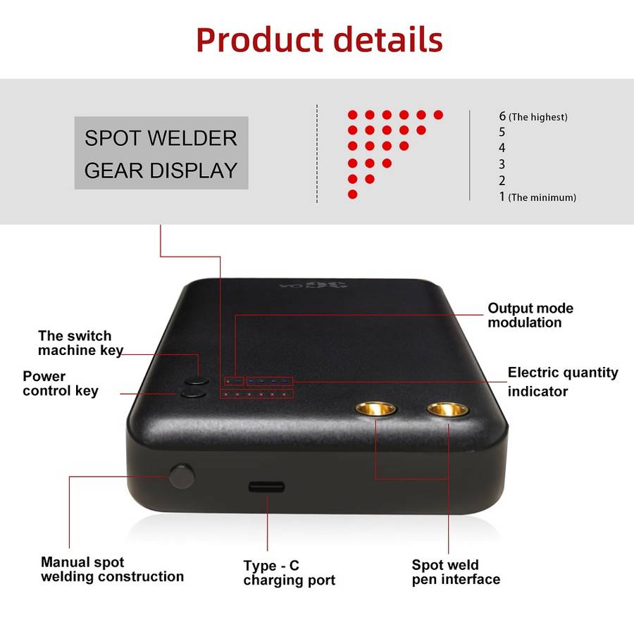 Product model: portable spot welding machine Battery type: Rechargeable polymer lithium battery Battery capacity: 5000mAh Output voltage: 4.2A (MAX) Output current: 650A (MAX) Design current: 1000A (MAX) Input interface: Typc-C charging port Input parameters: 5V/2A USB output: 5V/2.4A Product size: 160*94*25mm Recommended wedge thickness: 0.1~0.12mm