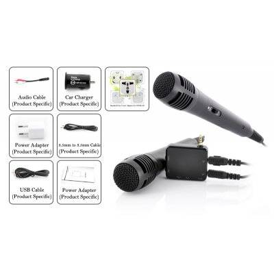 With two microphones means double the fun as you and a friend can perform a duet to all your songs. The microphone and echo can both be adjusted on the mini karaoke player. The karaoke player also includes a power cable that can be either charged via a power socket or through a car cigarette charger due to the removable adapters for each form of power.
