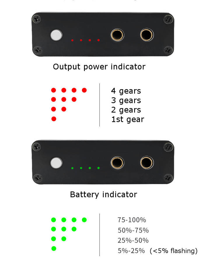 1. Long press the power on button, the green light shows the electric quantity, the red light shows the output power.