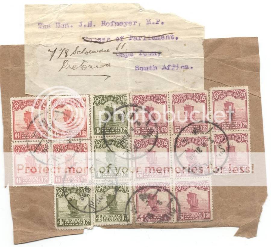 Unusual item. Rough piece, presumably from parcel or large envelope, 1931 (?) Shanghai China to J.H. Hofmeyer, M.P. Houses of Parliament. Address label attached which is torn. Paper has many creases.