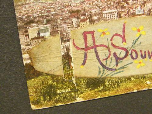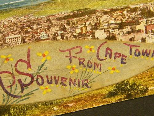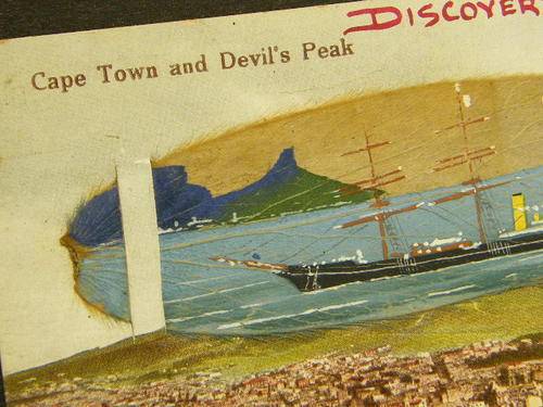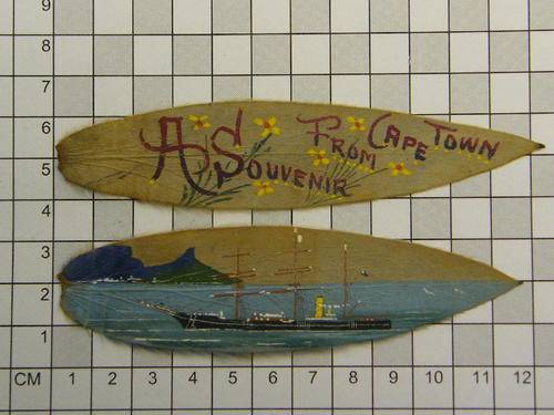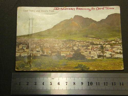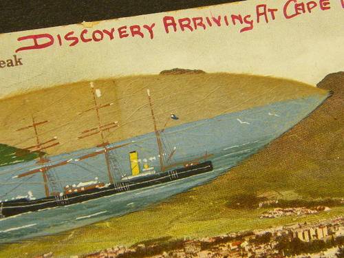Postcard plus painting on leaf of the Discovery arriving at Cape Town late 1920`s - as per photo
