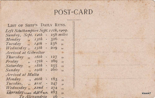 POSTCARD : SHIP'S TIMETABLE - SOUTHAMPTION - ALEXANDRIA : SEPT.11 1909 : PICTURE - MALTA