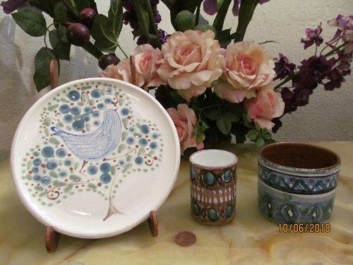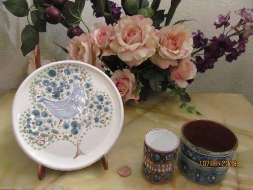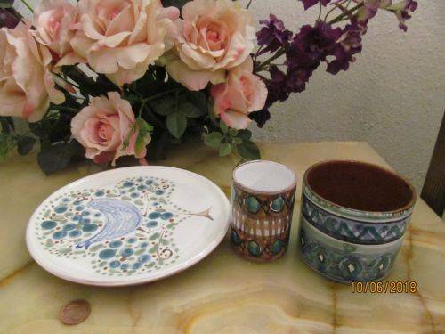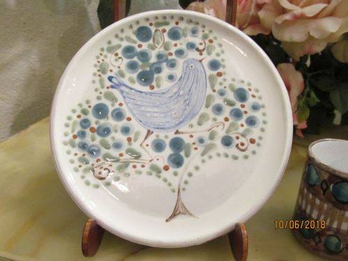 1)- A BEAUTIFUL SLIP TRAILED ART POTTERY PLATE. THE ITEM IS CRAFTED FROM A CARAMEL COLOR CLAY AND THROWN WITH LINEAR RIDGES UNDERNEATH. DECORATED IN SNOW WHITE AS A BACKGROUND AND USING THE SLIP TRAILING TECHNIQUE TO DEPICT A BEAUTIFUL LIGHT BLUE BIRD PERCHED IN A IMPRESSIONIST TREE, ALL IN REMARKABLE RAISED DETAILS GIVING AN ENAMEL APPEARANCE. A NATURAL HOLE IN THE UNDERSIDE HAS BEEN CRAFTED FOR HANGING UP. THE ITEM IS HAND SIGNED UNDERNEATH. IN PERFECT CONDITION WITH NO CRACKS, CRAZING, CHIPS OR DAMAGES. 1.6cm HEIGHT.....17.8cm DIAMETER OF RIM