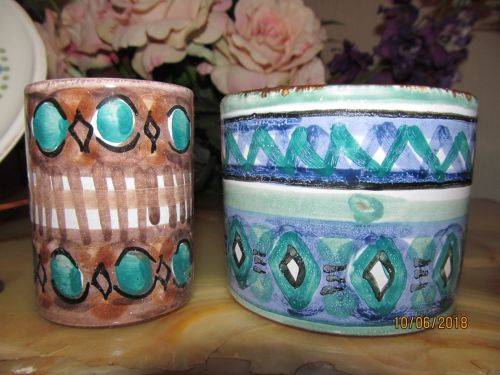 2)- A SMALL CYLINDRICAL SHAPED TRINKET CONTAINER/TOOTHPICK HOLDER MANUFACTURED FROM REDDISH CLAY AND DECORATED IN BROWNS AND SEA GREEN AND BLUE PATTERNS. THE ITEM IS HAND SIGNED UNDERNEATH - "214 RJA". THE ITEM IS IN PERFECT CONDITION WITH NO CRAZING, CHIPS, DAMAGES OR CRACKS 6.7cm HEIGHT.....5cm DIAMETER OF RIM