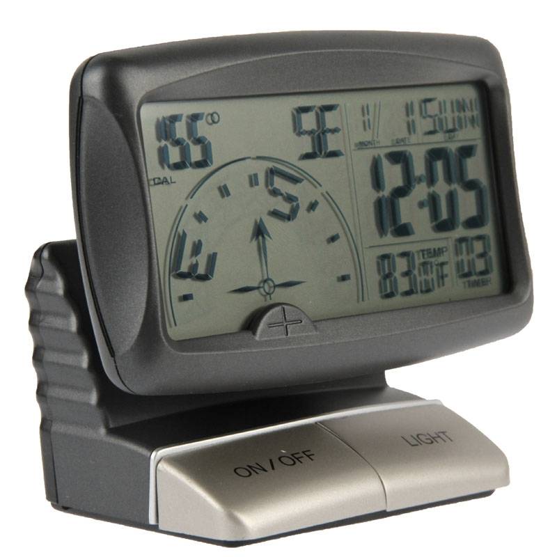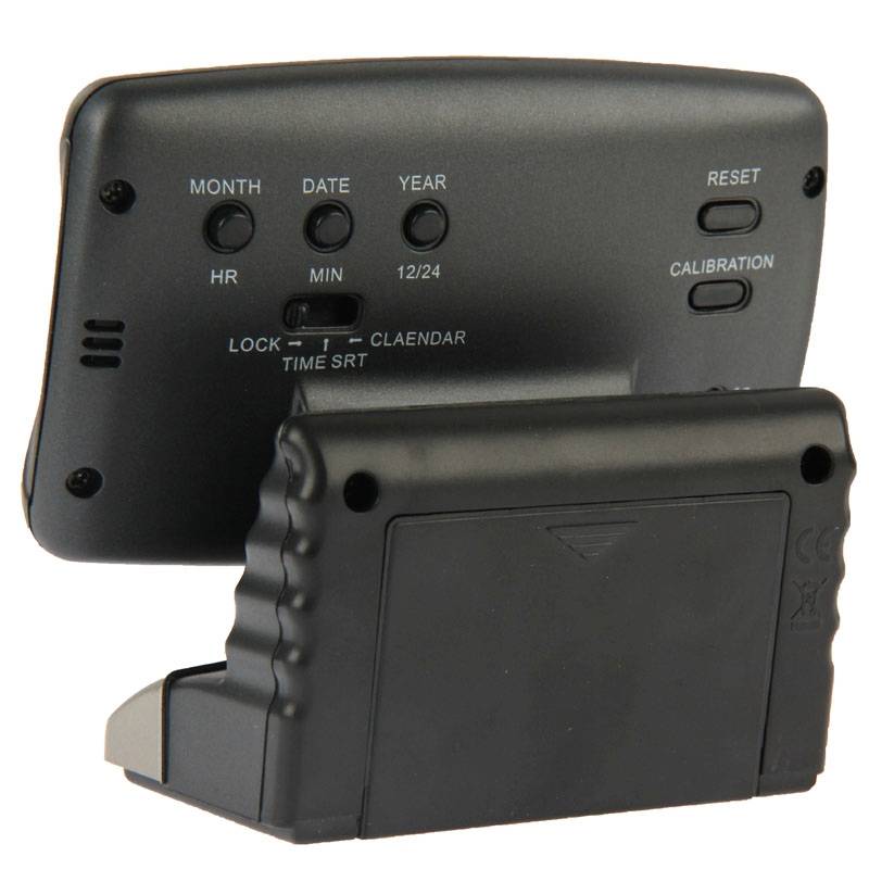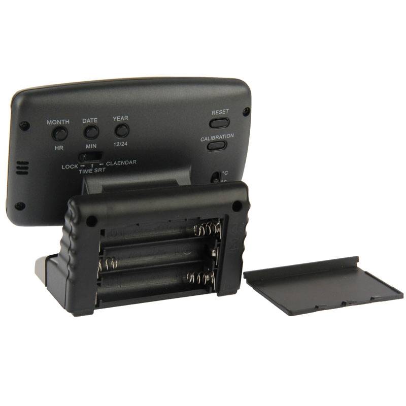 Features 1. With clock, thermometer and calendar function 2. Blue LED indicator 3. 7 seconds backlit time 4. 3.5 inch LCD, powered by 3 x AAA batteries (not include). 5. Range of angle variation: 5~355 degrees. 12/24 hours format. 6. Temperature range: -20~500 C / -4~120F