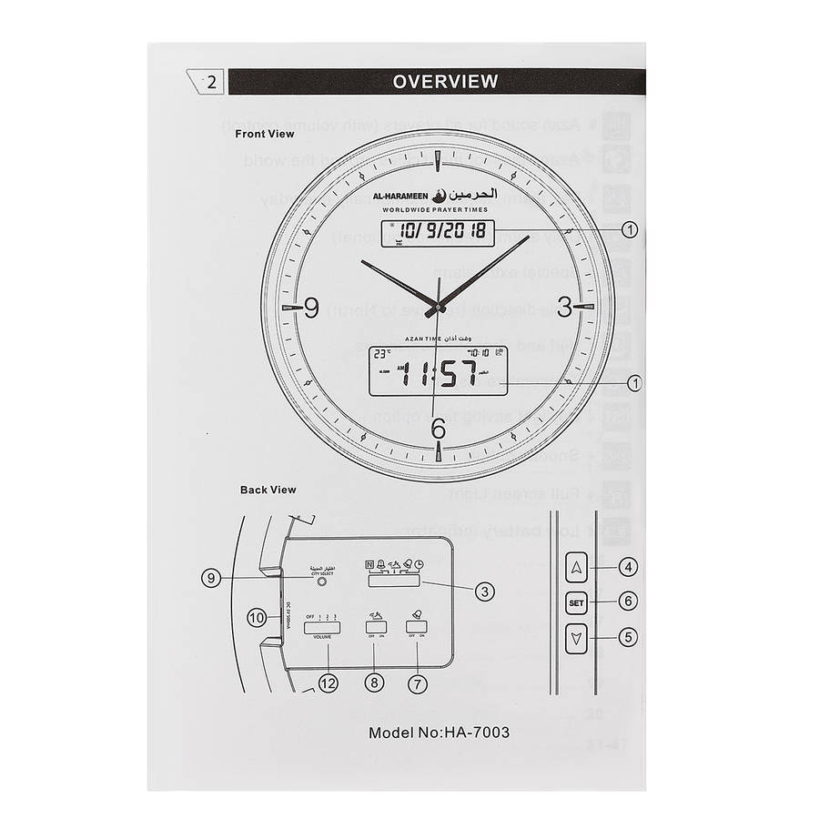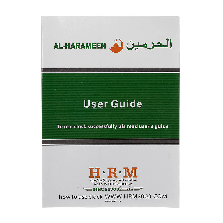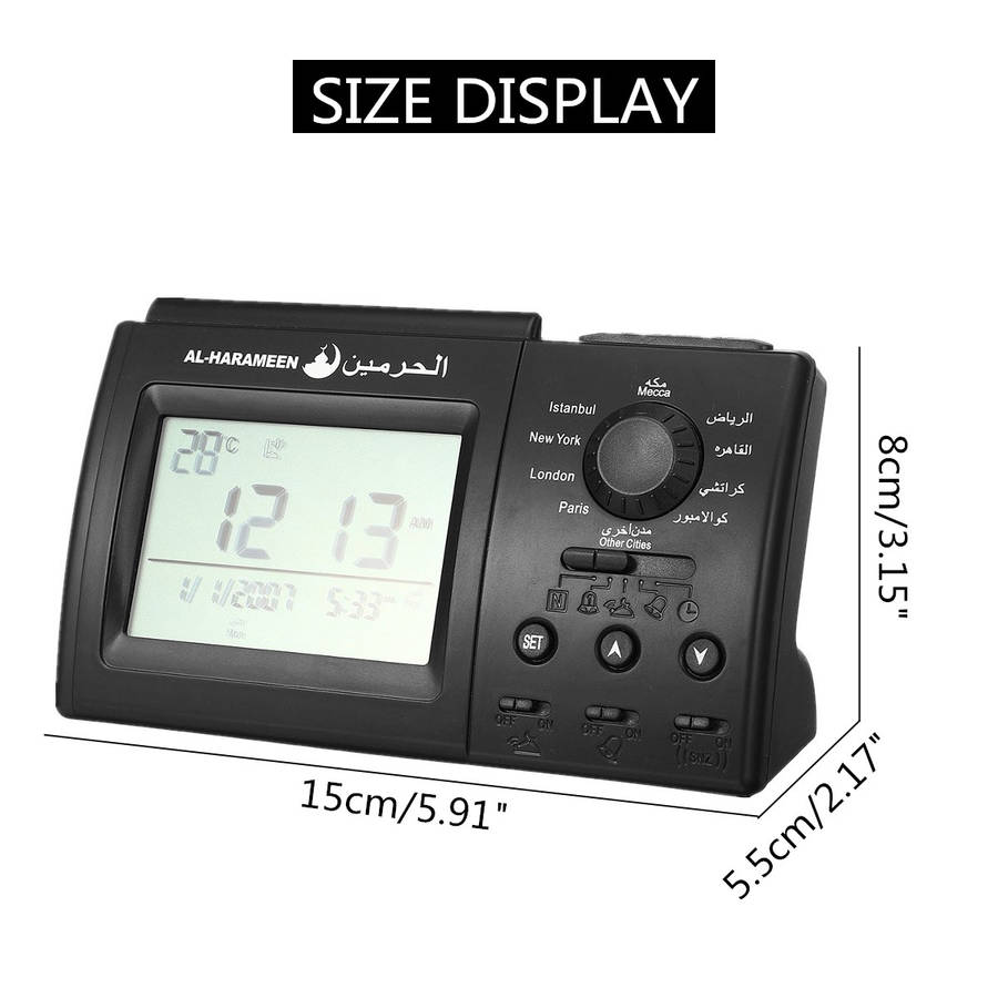 Functions: 1. Snooze option 2. Full screen El light 3. Audio out (Connect with speaker) 4. Material: ABS(Acrylonitrile Butadiene Styrene) Plastic 5. Color: Black 6. Size: 150x55x80mm 7. Power Supply: 2 x AA Batteries(Not Included)/DC 6V 300mA Adapter(Not Included) 8. Daylight Saving Time option ( for countries using this system ) 9. Gentle prayers reminder ( when azan sound is turned off ) 10. Could easily modify the diference time prayer to the outskirts of cities adopted it 11. Crescendo sound: All alarms have gentle wake-up sound that increase gradually. 12. One Time Alarm: In addition to Fajr and daily alarms, AL-HARAMEEN clock includes an extra alarm ( called 1-Day alarm ). It can be set to ring for special appointments. Package included: 1 x Prayer Alarm clock 1 x User manual 1 x pen ![]() ![]() ![]() ![]() ![]() ![]() ![]() ![]() ![]() |