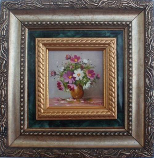 PRECIOUS LITTLE ORIGINAL by SUSAN CRONJE (LISTED ARTIST) - BEAUTIFULLY FRAMED IN DOUBLE ORNATE FRAME. SIZE: 19.5CM X 19CM (TOTAL SIZE WITH FRAME) SIZE OF ACTUAL PAINTING 7CM X7CM. SIGNED BY ARTIST.