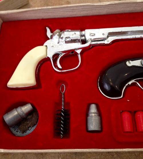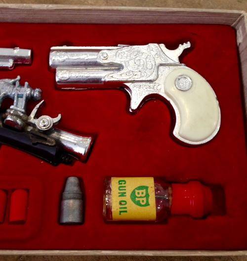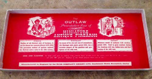 BCM Company (Derby) Ltd. Outlaw Presentation Case of Miniature Antique Firearms, consisting of: three guns, Cadet (G/VG, wear around hammer), Pistolet (VG), Pirate (some wear to chrome, G/VG); container for caps, plain card (no caps); selection of bullets ,Gun Oil bottle and cleaning brush. Contained in VG presentation box with red lining.Very good condition .