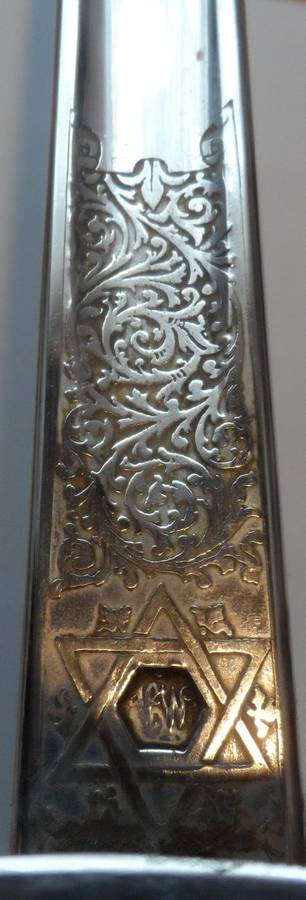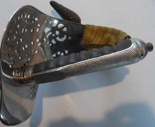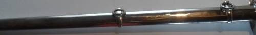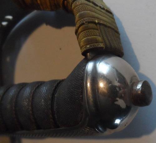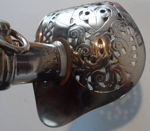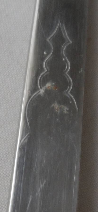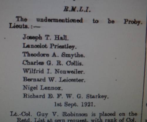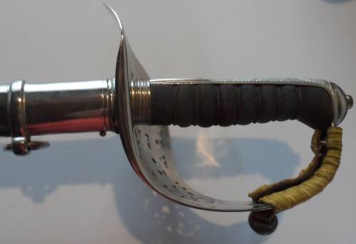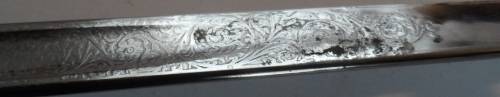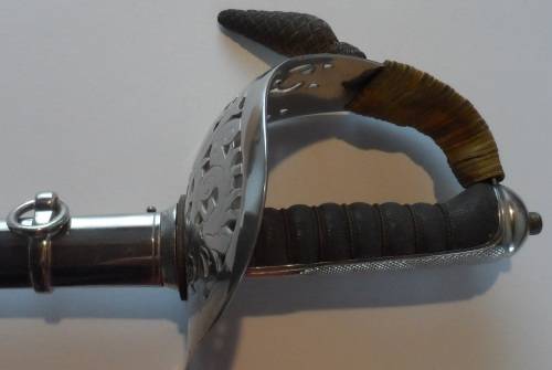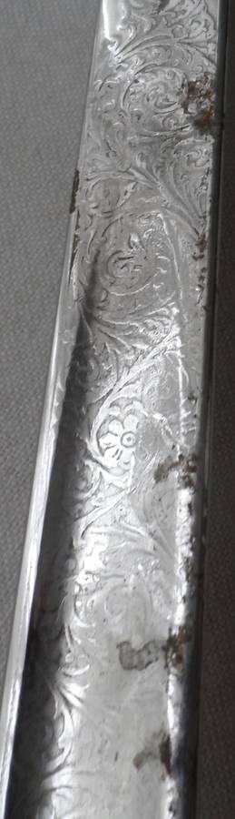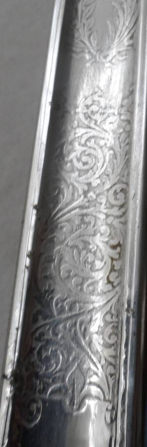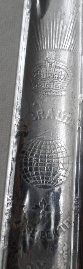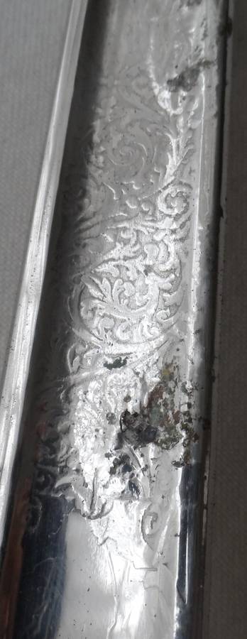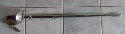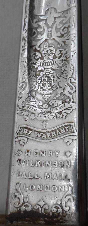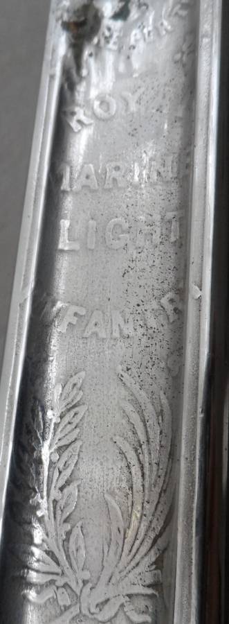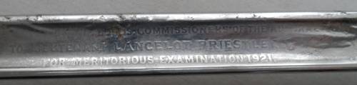 Sword with scabbard, King George V monogram on guard, length of blade: 82cm, total length in scabbard: 101cm, chromed. -Henry Wilkinson Pall Mall London. One side of the blade has the wording: Royal Marine Light Infantry and their badge, the other side reads: Presented by the Lords Commissioners of the Admiralty to Lieutenant Lancelot Priestley, ? for Meritorious Examination 1921. The chrome on the blade is blistering in spots, some slight spots of surface rust including the tip of the blade, otherwise the rest is in good condition including the scabbard. See additional information regarding Lieutenant Priestly. Shipping option is at the buyers choice and cost.