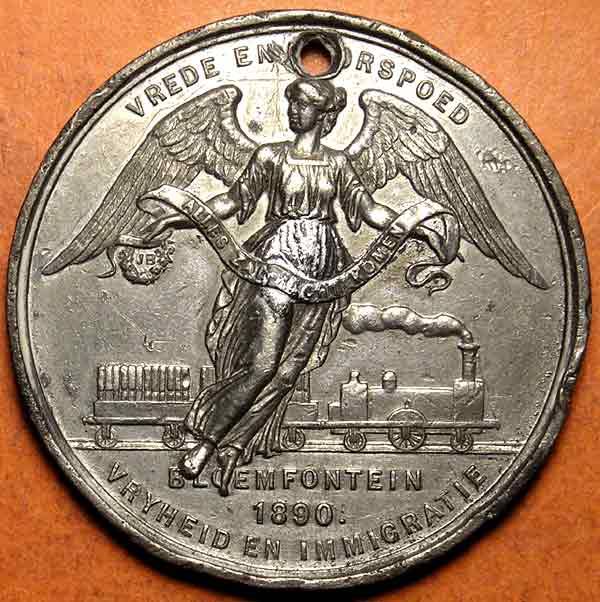 A Medal to Commemorate the Opening of the Railway Line from Beaufort West to Bloemfontein in 1890. The obverse shows FW Reitz, President of the Orange Free State. The line was extended to reached Johannesburg in 1892, thus linking Cape Town with Johannesburg. This medal is scarce. Reference: AM 38; www.southafricanmedals.com No. 0246.