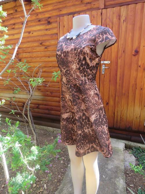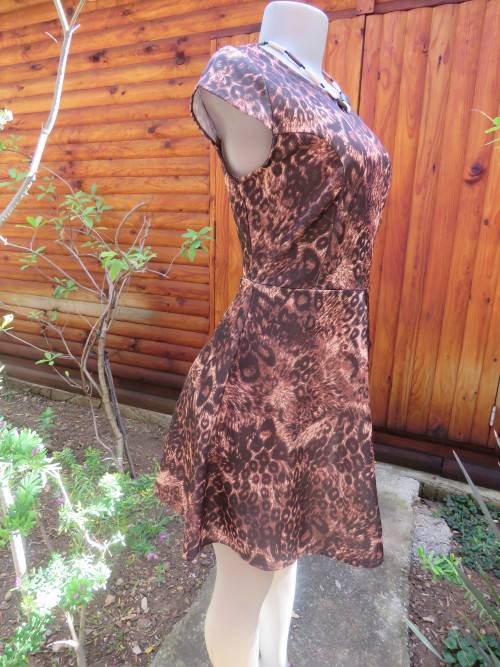 Pretty animal print dress by RT in W+W polyester.Size 34/10.Tiny capped sleeves.Good condition