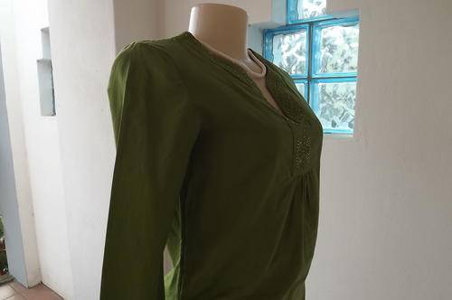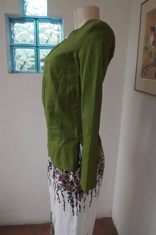 Pretty embellished avo green long sleeve top.V Front with slit.Size 30/6.100% Cotton with no stretch