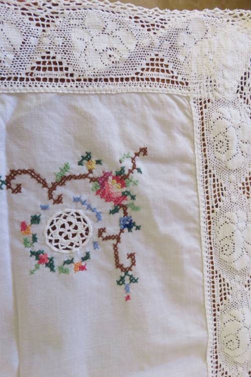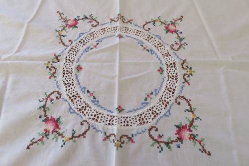 White square tablecloth with hand embroidered cross stitch flowers and lace edging. Excellent condition. 92cm x 92cm.
