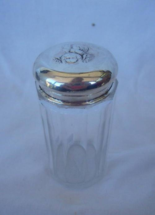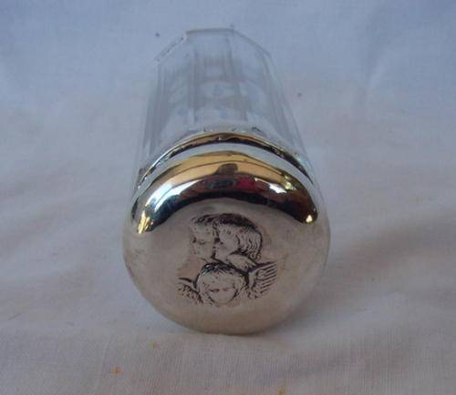 PRETTY HALL MARKED SILVER AND CRYSTAL VANITY BOTTLE - WITH AN ANGEL STAMPED ON THE TOP - MADE I