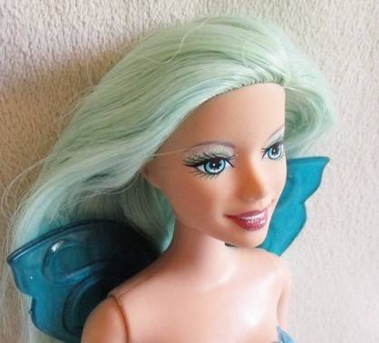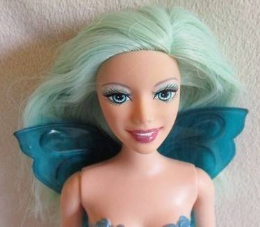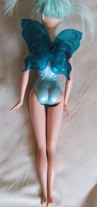 30CM TALL AND IN VERY GOOD CONDITION WITH LOVELY AQUA COLOURED HAIR, PERMANENT COSTUME AND PRETTY WINGS. MARKED '2004 MATTEL INC' ON THE BACK OF HER HEAD. REFER IMAGES