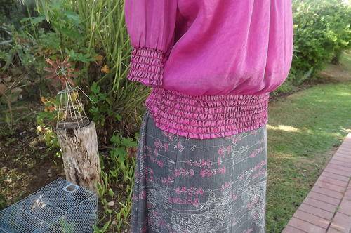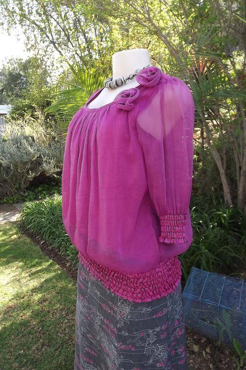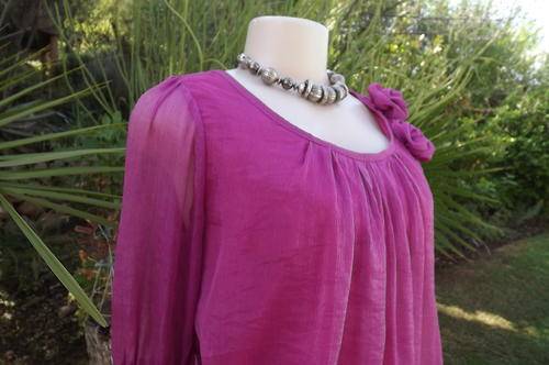 Pretty mexican pink sheer polyester top with lining by Cool Ice size 36/12.Blouson style with elasticated middle and cuffs.Rounded neckline with 2 fabric roses.Used but in good condition