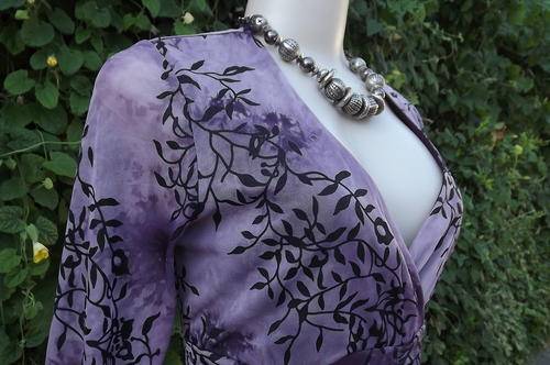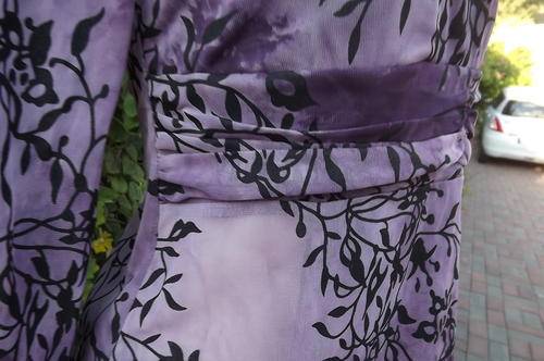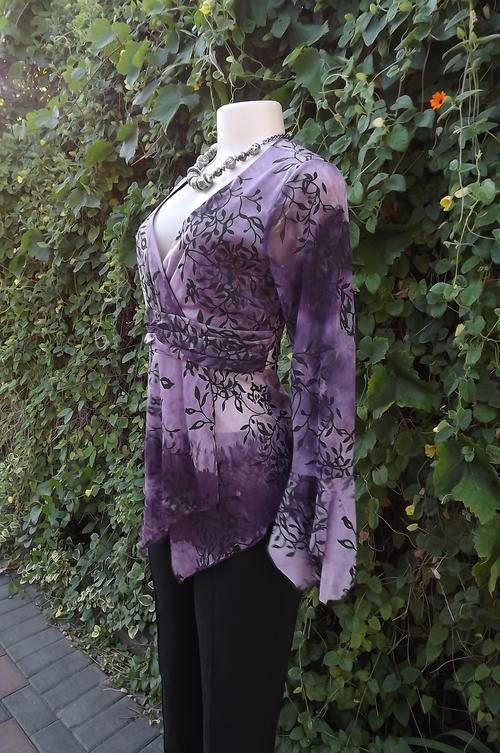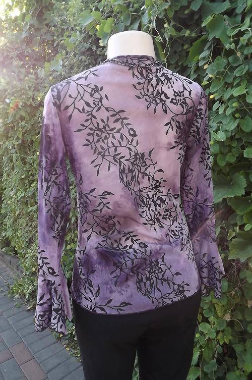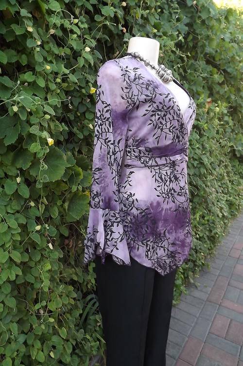 Pretty mulberry colour top by Oasis with black velvet embossed pattern.Size 34/10.High low seam and flare sleeve cuffs cross over.V front.Sheer 100% polyester.Bust lined.Good condition.