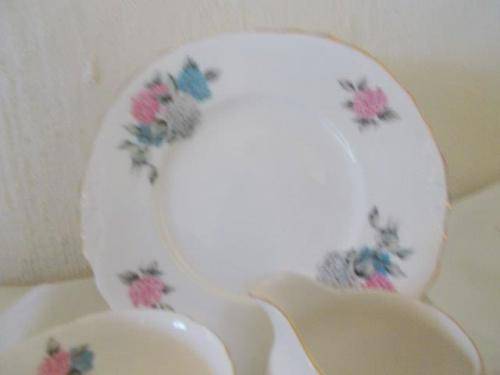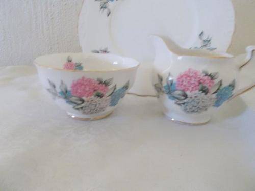 Nice pretty fine bone china Royal crown pink and blue flower pattern cake plate with a milk and sugar bowl combo all items are in good used condition no damage notedplease have a look at my other listings *Free sprit*Thank you