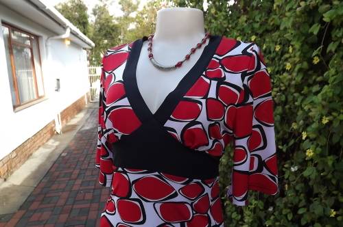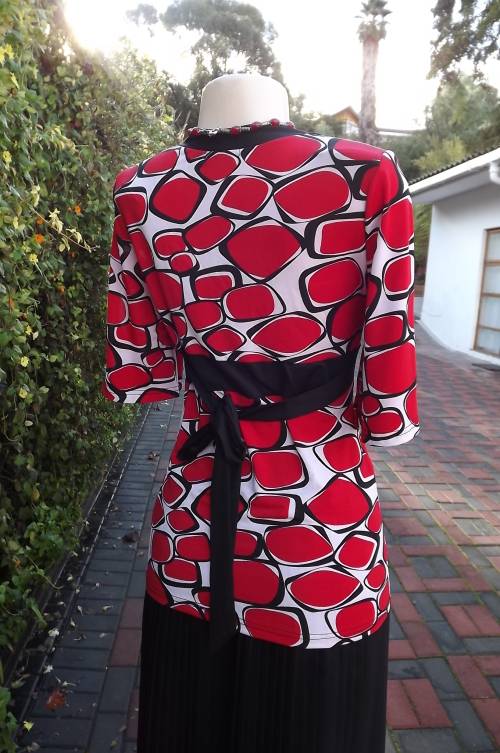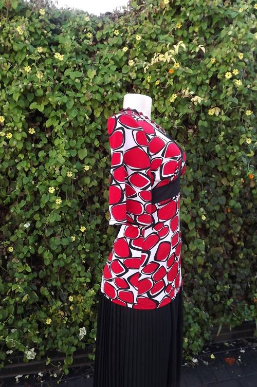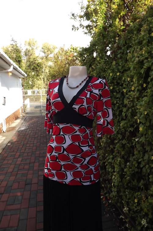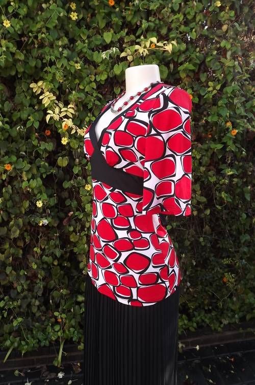 Pretty red,white and black silky stretch top in striking print by Posh Star.Size 34/10 V neck with black corssover band on Front.Short wide cut sleeves.two bands to tie at back.In stretch polycotton. Very good condition.
