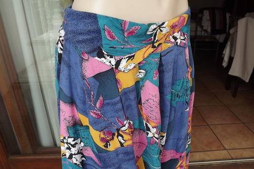 Pretty two piece outfit in blue,pink and mustard floral by Charlotte size 42/18.Skirt with pleated front and yoked middle.Elasticated at back.Button down top with hidden buttons.Very good condition