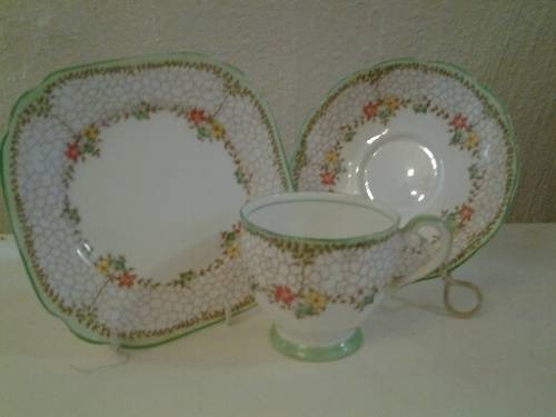 very nice green and decorated with small colorful flowers bell china tea cup trio i have five of these will list separate on my site
