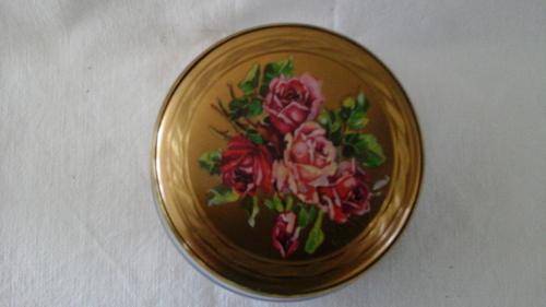 PRETTY, VINTAGE GWENDA MADE IN ENGLAND POWDER BOWL WITH FLORAL PATTERNED LID OF BRASS. NEVER USED. 40MM BY 30 MM. NO CHIPS NO CRACKS