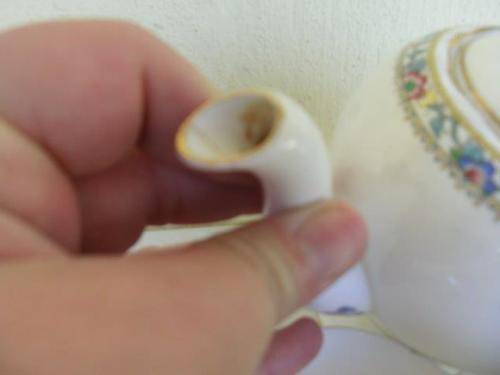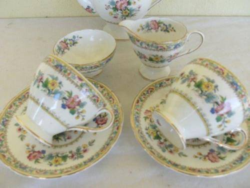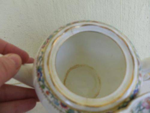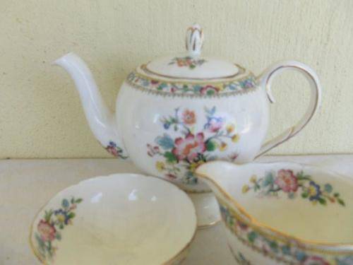 PRETTY VINTAGE OLD FOLEY MING ROSE PATTERN TEA FOR TWO SET ITEMS THE TEA POT HAS TWO SMALL HAIR LINE CRACKS ONE ON THE SPOUT ONE ON THE INSIDE OF THE POT ONE TEA CUP DUO HAS A HAIR LINE CRACK OTHER WISE ITEMS ARE STILL PRETTY NO CHIPS