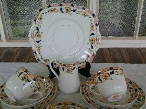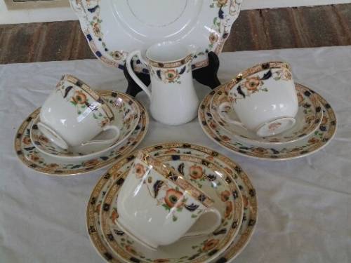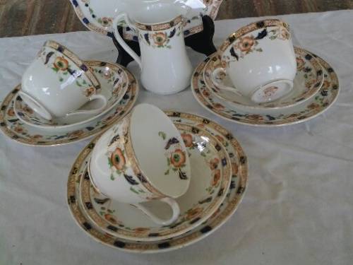 Pretty vintage part Tuscan porcelain tea set items consist of three trios and milk jug with cake plate all items in good used condition no damage noted