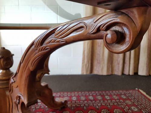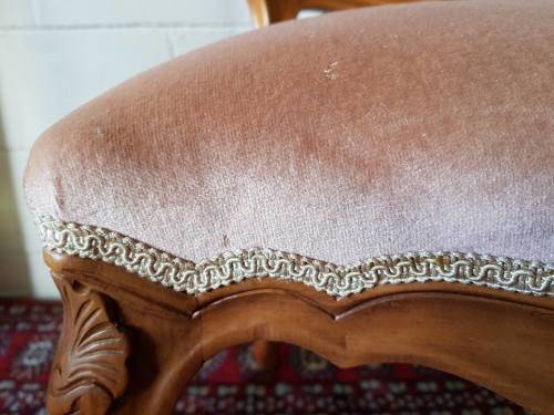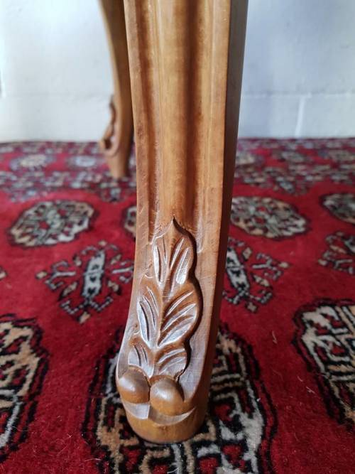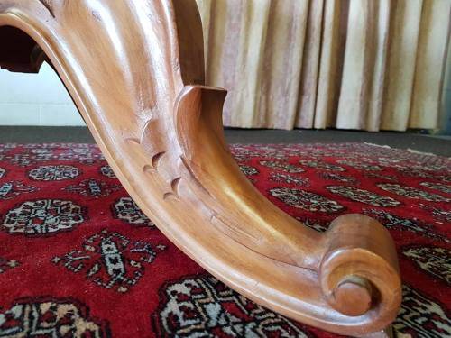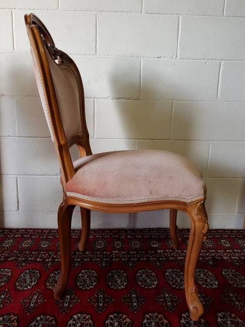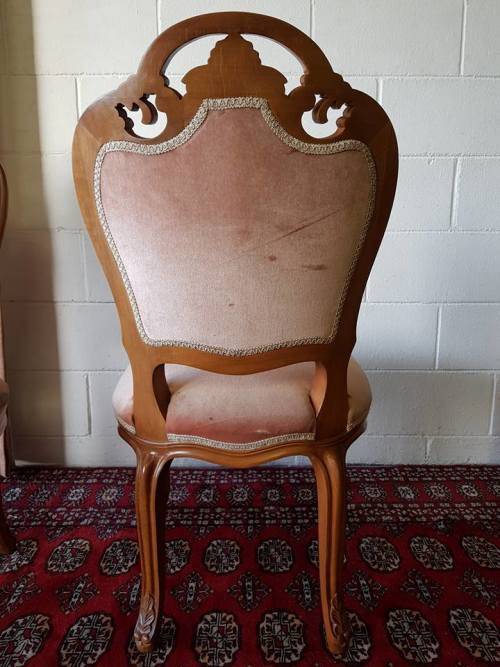 This truly magnificent antique Victorian solid Walnut dining room suite is truly something to behold. The suite contains a large round glass top table and six upholstered chairs that are all stunningly carved by what could only have been a master craftsman. The floral carvings in the light Walnut wood is complimented perfectly with the 'dusty pink' period style upholstery and the suite has massive appeal to it. This suite would be perfect in an elegant dining room that needs an amazing antique center set to complete it. The suite measures as follows: the six upholstered dining chairs each measures 60cm long x 49cm wide x 95cm high and the wonderful dining table measures 148cm across x 76cm high. Just look at these pictures, the suite is magnificent! The suite has wear and tear consistent with it's impressive age but that adds wonderful character to these antique furniture pieces. The chairs have some damage to the upholstery but could ideally be re-upholstered to suite your decor needs. Please view the pics to confirm the condition of this absolutely stunning antique dining room suite.