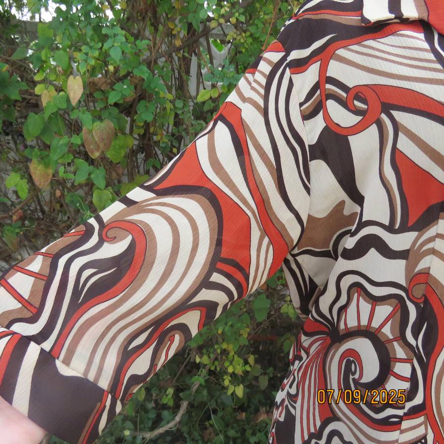 PRIMA geometrical printed button down top in pretty autumn colours. In slightly creased 100% polyester fabric. Open collar. Elbow length sleeves with cuffs. Size 42-18. As new condition.