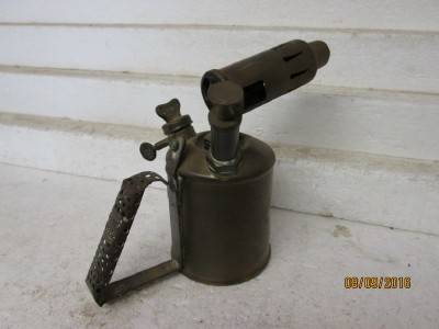 THIS BLOW TORCH LOOKS LIKE IT IS COMPLETELY MADE FROM BRASS, EXCEPT THE METAL HANDLE.