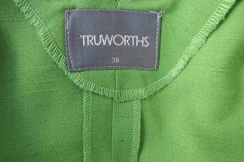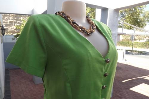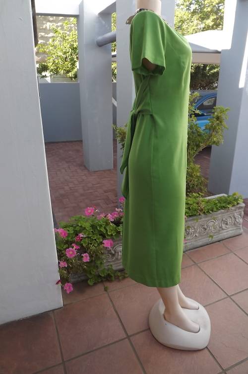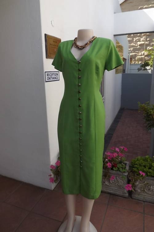 Princess style button down ankle length green dress from TRUWORTHS size 38/14.Low v neck at back and v at front.Short sleeves.Wide bands in sides to tie at back.High pleat at back.In cotton and linen blend fabric.As new
