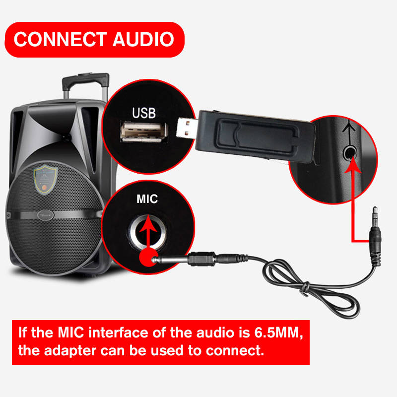 null Features: Adopts UHF technology, remote wireless transmission makes operation easier without annoying wires, can achieve 80m of the transmission distance. Broader frequency range, less interference, showing your voice easily and perfectly Adopts the exacting complete electronic circuit control, capture rich, full-bodied sound from sources that are directly in front of the microphone. For all events like Karaoke, live-performances, conference, church, school, hall, party, etc. Can used with 3.5mm and 6.35mm female interface devices. USB receiver power supply by USB charger,powbank and more. Suitable for studio / karaoke / radio / etc. Suitable for teacher guides, sing, speech conference and etc. Specification: Color: Black Material: Plastic+Metal Microphone Size: approx. 24.5x5cm Audio cable length: approx. 60cm USB Receiver Size: 8x2.5cm VHF Frequency Range: 268.85mhz (with screen) Audio Frequency Response: 40Hz-15KHz Audio Dynamic Range: >100dB Audio Output: 0-200mv Receive Distance: ≥80M Transmitter Working Current: <80mA Power supply: 2 x AA battery (not included) Operating temperature: -10 - 50℃ Fitment: All equipments with wired microphone interface are suitable. Package included: 1 x Microphone 1 x USB Receiver 1 x 3.5mm Audio Cable 1 x 3.5mm to 6.35mm Adapter |