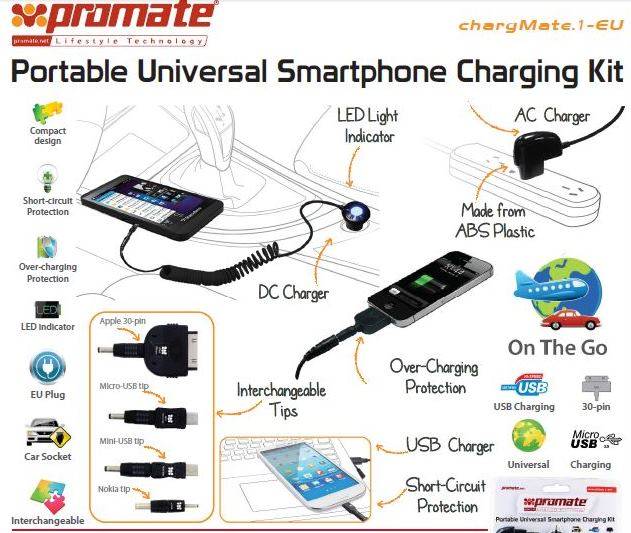 Product Overview The Promate ChargMate.1, 27 in 1 Universal Mobile Charger is an easy way to charge your mobile phone whether you are at home or the office or even in your car when traveling. The Promate ChargMate.1 give you 27 different charging possibilities with the 9 charging tips to fit almost all devices that enable you to charge almost all mobile devices anywhere. This universal pack includes a wall adapter and car charging adapter along with USB cable for covering the maximum charging needs.