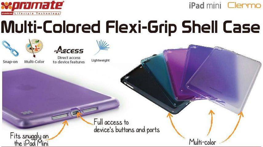 Product Overview The All-New Promate Clermo contemporary case collection for iPad Mini are designed uniquely for both style and durability which incorporates the latest technology for strength and comfort. Cases fit snugly on the iPad Mini whilst offering full protection from knocks and scrapes; the cases also ensure that you will have complete access to the phone¿s external features. This case collection doesn¿t only offer a unique design; also have an extensive variety of colors and patterns available for you to match your everyday lifestyle need.