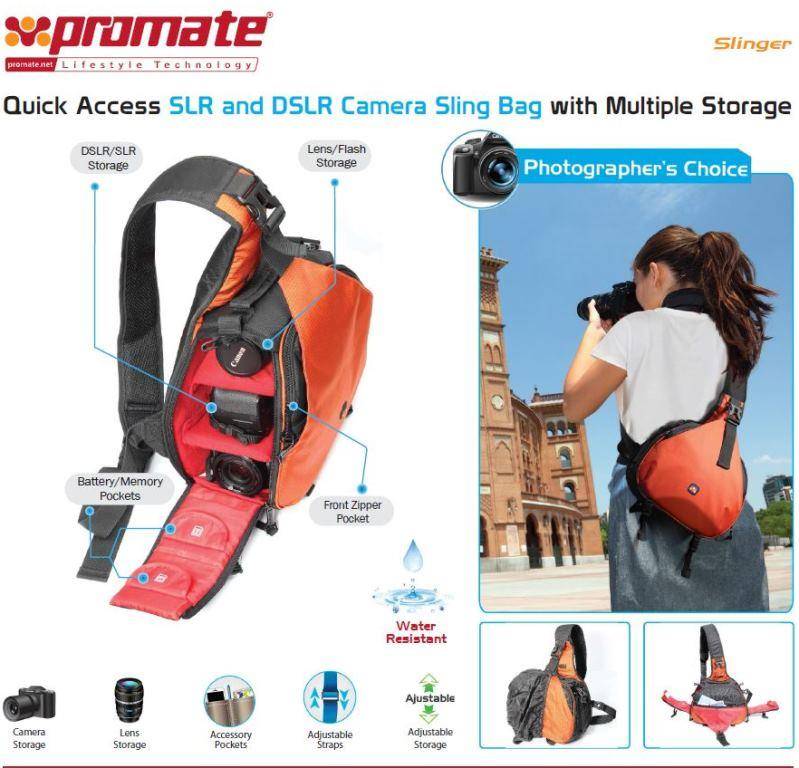 The Promate Slinger Quick Access SLR Camera Sling Bag with Multiple Storage options is a compact all day use DSLR camera sling bag has enough space to carry your DSLR camera, additional lenses as well as other accessories. Slinger sports multiple accessory pockets, holders for other stationary items. Additionally the bag is designed to provide quick access to your camera and other accessories. Shoot on the go with Slinger.