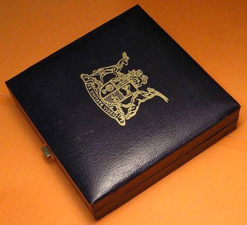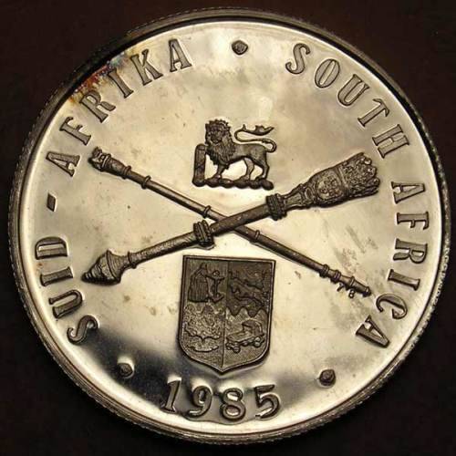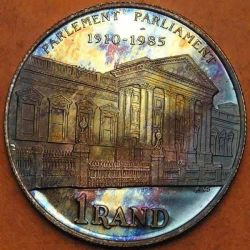 A Proof Silver Parliament Rand dated 1985. Struck for the 75th anniversary of the opening of the first SA Parliament in 1910. In original SAM case of issue with white cardboard sleeve.