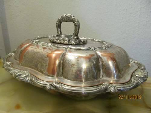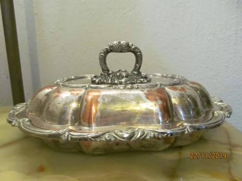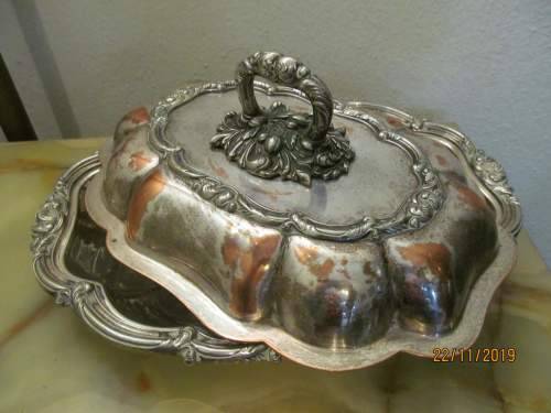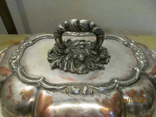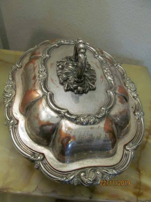 AN ANTIQUE SILVER PLATED COPPER CASSEROLE / VEGETABLE / SERVING DISH WHICH IS HEAVIER THAN MOST I'VE DEALT WITH AND EXTREMELY SOLIDLY MANUFACTURED WITH ALL DECORATIONS UPON BOTH THE LID AND BASE PAN BEING DONE IN A SOLID EMBOSSED CRAFT AND NOT IN REPOUSSE. THIS MAGNIFICENT ITEM IS ALSO FITTED WITH A REMOVABLE ORNATELY DESIGN HANDLE FINIAL DEPICTING LARGE BAROQUE PLUMES AND SCROLL MOTIF. THE HANDLE TWISTS TO THE SIDE AND IS THEN REMOVED, PERMITTING THE LID TO BE TURNED OVER AND UTILIZED AS A SEPARATE SERVING PAN OR DISH.