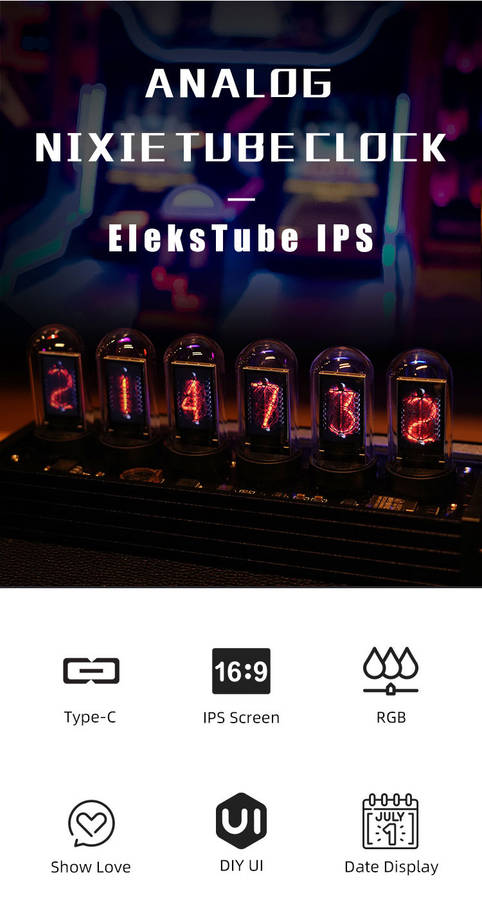 Model: EleksTube IPS Size: 210*82*80mm Weight: net weight 425g Gross weight including packaging about 1kg Power supply: 5V-0.45A (power about 2W) Software: Support Windows8/Windows10 Interface: Type-C (both left and right, easy to place) Screen: 16:9 IPS hard screen, resolution 135x240 pixels Picture format: Custom pictures only support BMP format Time: 12 hours/24 hours display can be set Package includes: 1 x EleksTube IPS clock