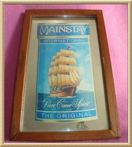 PUB MIRROR , PRINTED " MAINSTAY INTERNATIONAL 43% ALC. VOL. 750ml A52 PURE CANE SPIRIT THE ORIGINAL ". size 180mm X 275mm, some wear, no chips.