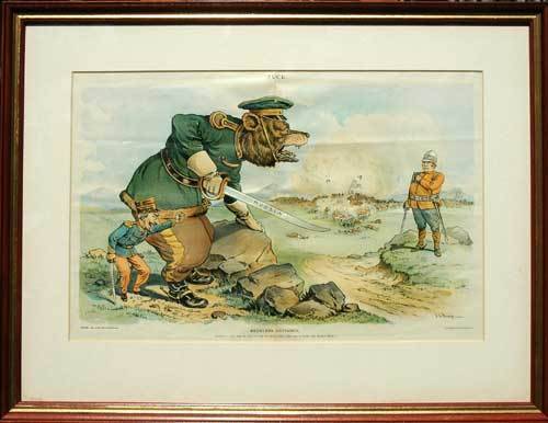 The imperialist rhetoric of 'civilization' versus 'barbarism' that took root during these years was reinforced in both the United States and England by a small flood of political cartoons - commonly executed in full colour and with meticulous attention to detail. Most viewers will probably agree that there is nothing really comparable in the contemporary world of political cartooning to the drafting skill and flamboyance of these single-panel graphics, which appear in such popular periodicals as Puck and Judge."