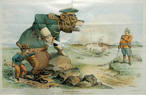 "RECKLESS DEFIANCE - British and French Imperial Rivalry. Having fought two wars together as closest of allies, it is easy to forget that only a few years before Britain and France were bitter rivals for world supremacy and vied with each other to carve up Africa into their colonial empires. More than once, two colonial powers nearly went to war over now long forgotten territorial disputes in Africa. This cartoon portrays France as a little man defiantly challenging the stalwart British, while hiding behind a bumbling Russian Bear. At the time the Russian Empire was another great rival of Britain. " BoerWarArchives.com