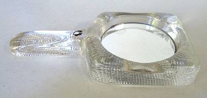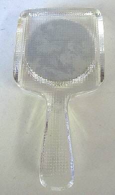 A very unusual glass-framed hand mirror, made in Sweden by Pukeberg. Still has its orginal paper sticker. No chips or cracks. Length 179 mm; width 89 mm.