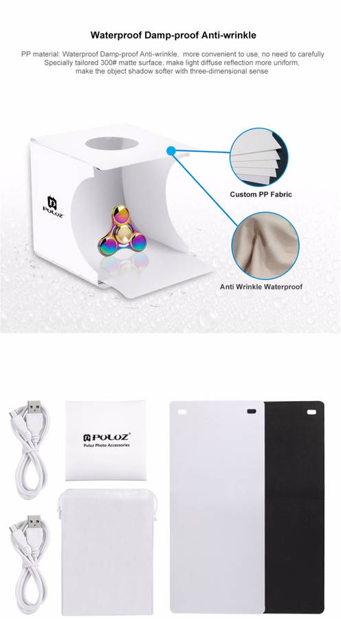 With 2 backgrounds pads(black and white), and build-in light and USB cable (You should prepare a usb charger to power it.).Material: Plastic