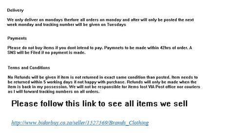 R35.00 Standard shipping using one of our trusted couriers applies to most areas in South Africa. Some areas may attract a R30.00 surcharge. This will be calculated at checkout if applicable.