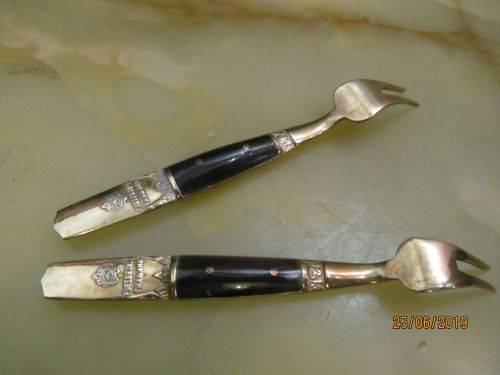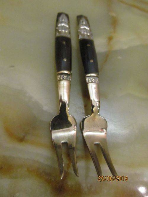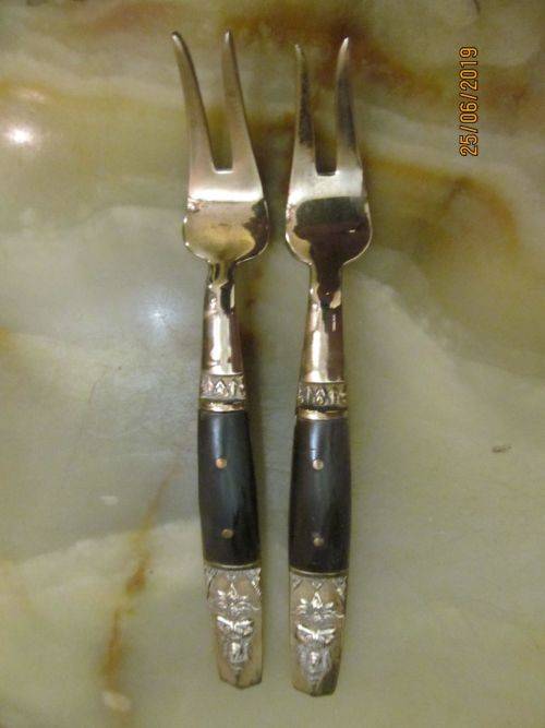 THE LOT / SET CONSISTS OF TWO IDENTICAL PICKLE / HORS D' OEUVRES FORKS MANUFACTURED FROM BRONZE WITH RIVETED BLACK POLISHED BAKELITE HANDLES ATTACHED ON EITHER SIDE