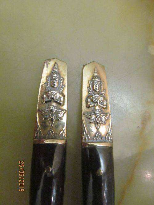 MANUFACTURED IN THAILAND, THESE COLLECTABLE BRONZE AND BAKELITE CUTLERY ITEMS HAVE BECOME KNOWN AS BUDDHA FLATWARE DUE TO THE CRAFTED BUDDHA IMAGE IN RAISED DETAIL UPON THE HANDLE TOPS.