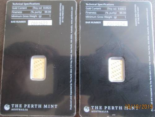 YOU ARE BIDDING ON THESE TWO BARS A TOTAL OF TWO GRAMS BID PER SET 99.99% IN THE PUREST OF GOLDBY THE PERTH MINT OF AUSTRALIATHE CARD MEASURES 85mm x 55mmTHE BAR MEASURES 15mm x 10mm THE BEAUTY OF THESE BARS ARE UNDER THE PROTECTIVE FILM WHICH CAN BE TAKEN OFF AND RE-USED AGAININ A TAMPER PROOF CASINGBID WITH CONFIDENCE FROM A VERIFIED SELLER