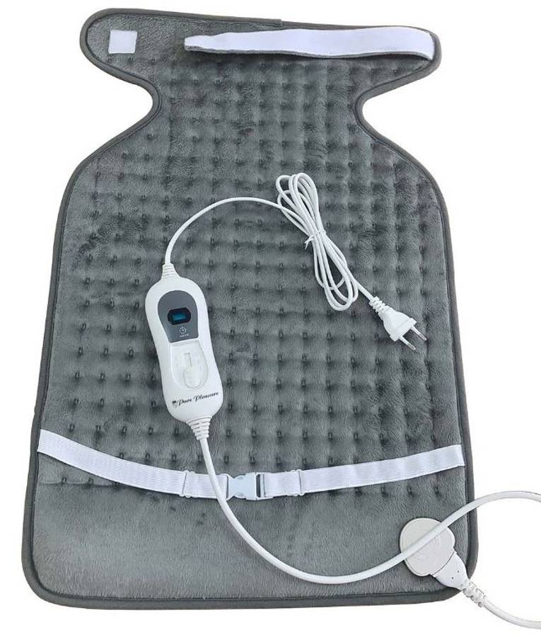 Pure Pleasure Electric Heating Neck/Back Pad - therapeutic heating pad designed to relieve stress, tension, and muscle aches in the neck and back areas. It features a super soft fleece material for comfort and warmth, with an adjustable back and shoulder strap to ensure a good fit. The pad offers multiple heat settings (typically 3 or 4) for personal comfort and includes safeguard protection against overheating.